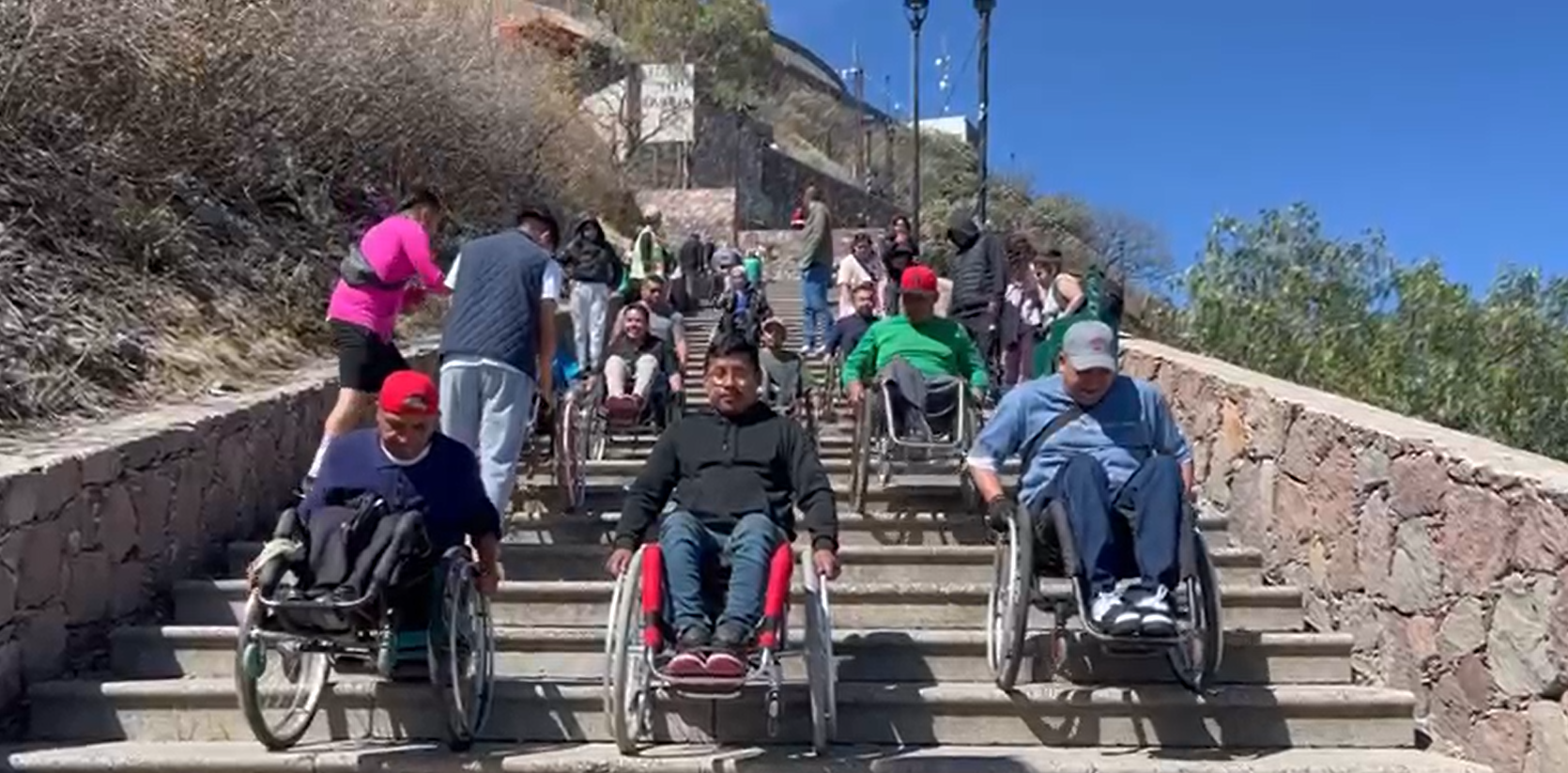 Con la técnica de dos puntos, las más de 100 personas usuarias de silla de ruedas que se integraron a la práctica bajaron a través de un total de 312 escalones.