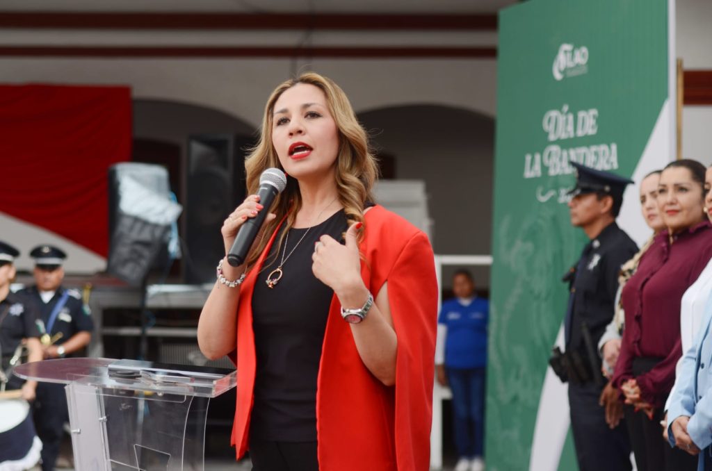 En la conmemoración del Día de la Bandera, la presidenta municipal de Silao, Melanie Murillo, abanderó a cinco planteles educativos en el patio de la Casa de la Cultura, donde también refrendó el pacto por la protección de niñas, niños y jóvenes.