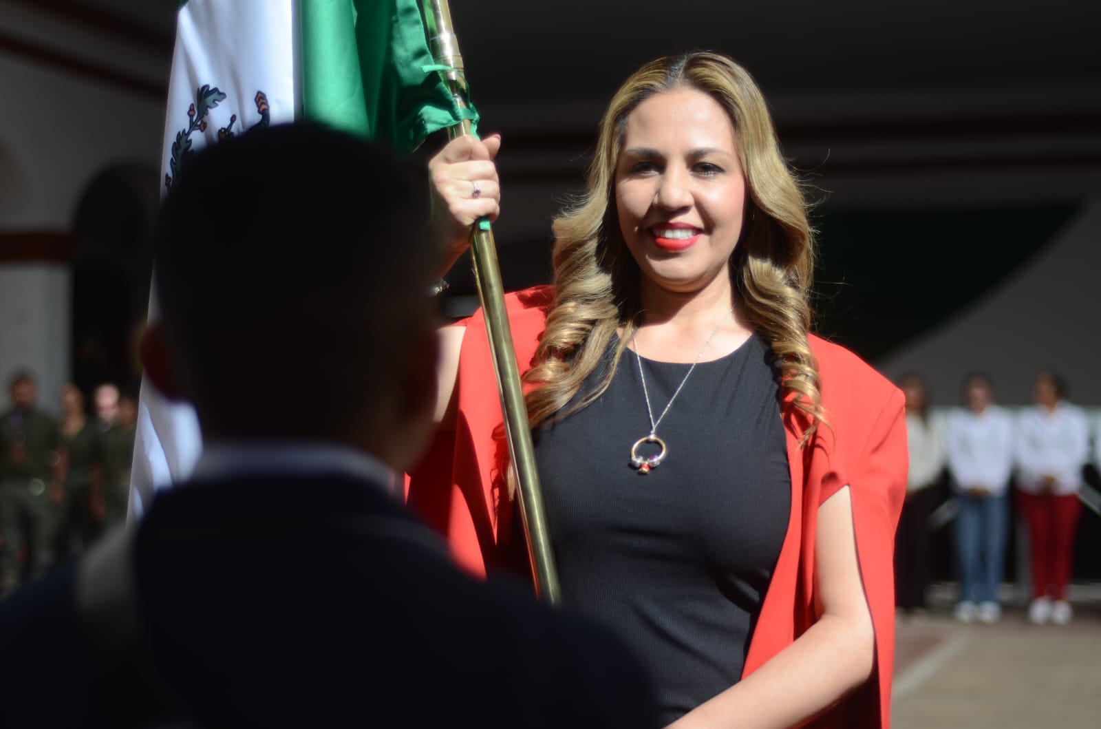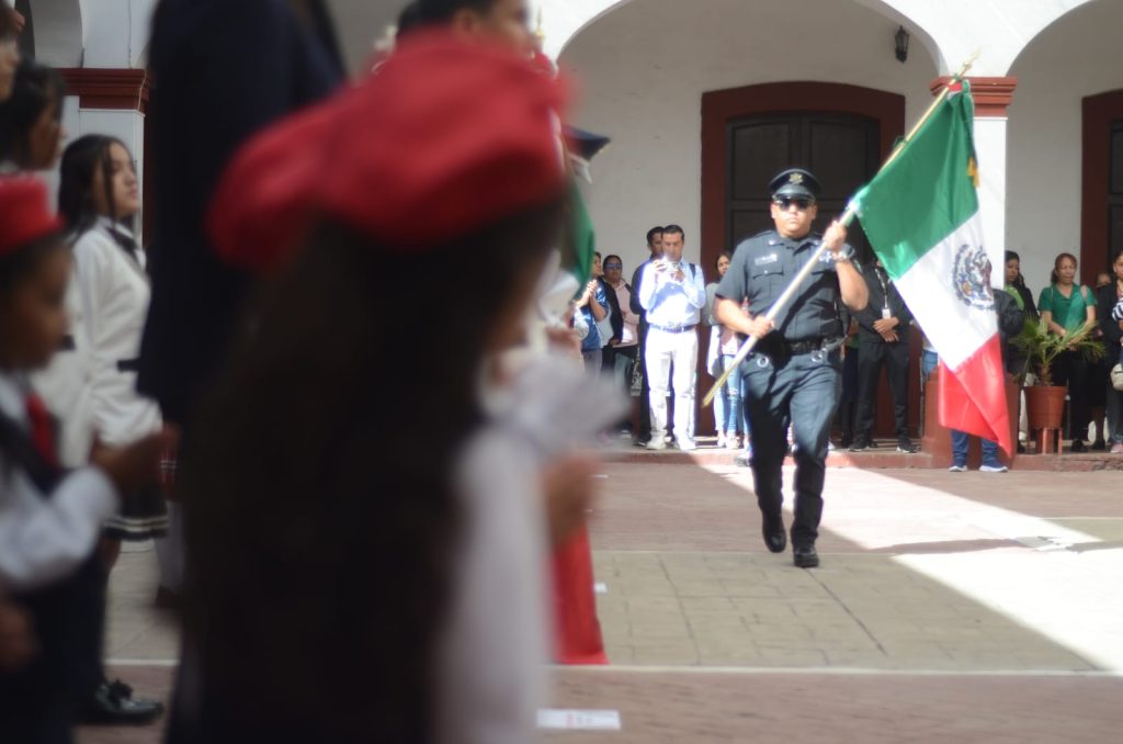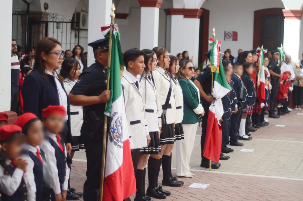“Los honores a la Bandera, además de que damos vida a nuestro patriotismo y a nuestros valores cívicos, también se prestan a la convivencia”, expuso la Presidenta Municipal ante madres y padres de familia, docentes y estudiantes de las cinco instituciones que acudieron al abanderamiento.