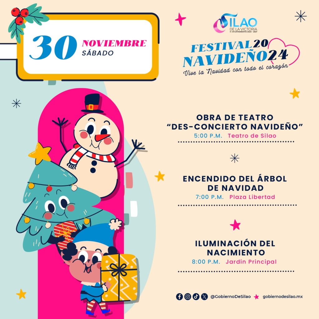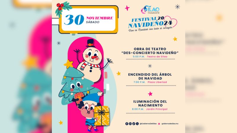 El primer Festival Navideño de Silao arrancará este sábado 30 de noviembre con la obra teatral “Des-concierto Navideño”, el encendido del Árbol de Navidad y la iluminación del tradicional Nacimiento. Y todos los eventos son gratuitos.