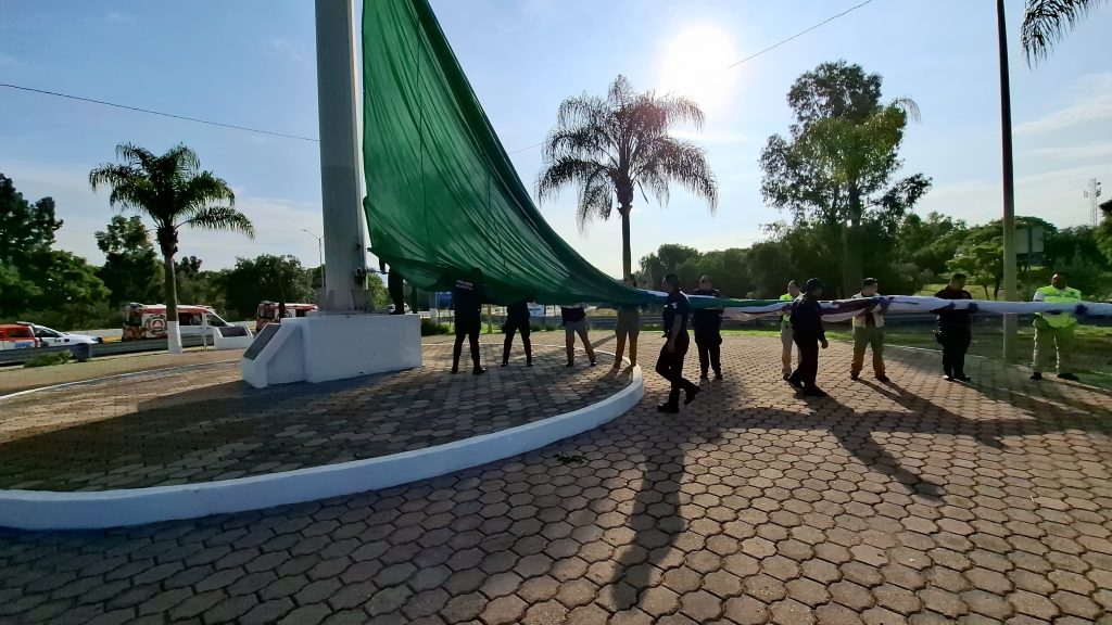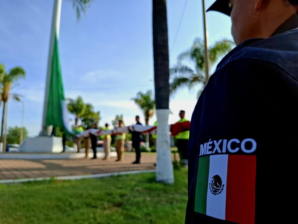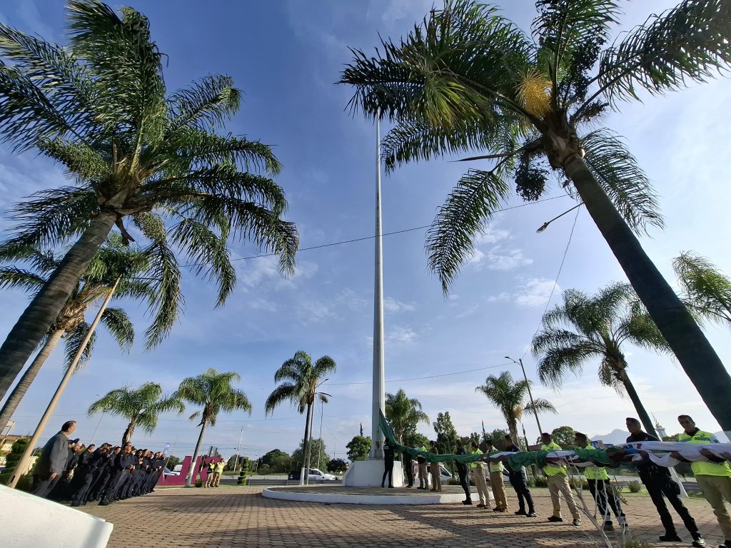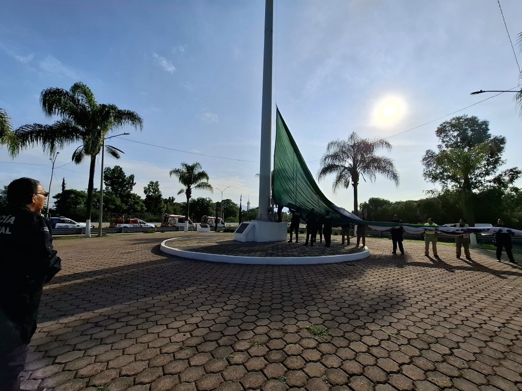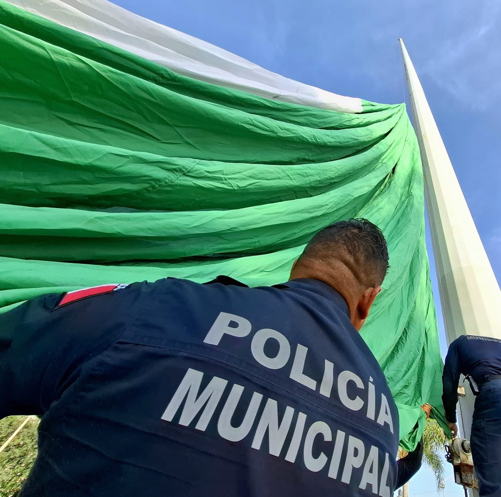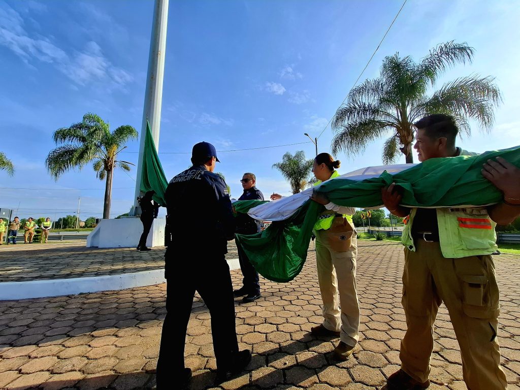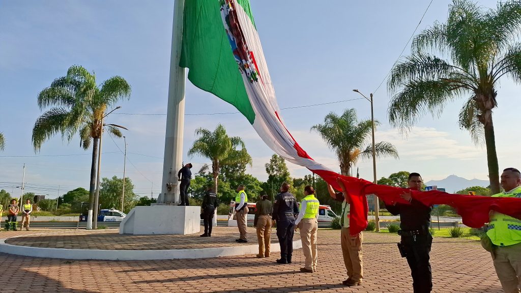 El izamiento se realizó a las 8:00 de la mañana en punto de este domingo 13, con la participación de elementos de la Policía Preventiva, del área de Tránsito Municipal y de la coordinación local de Protección Civil.
